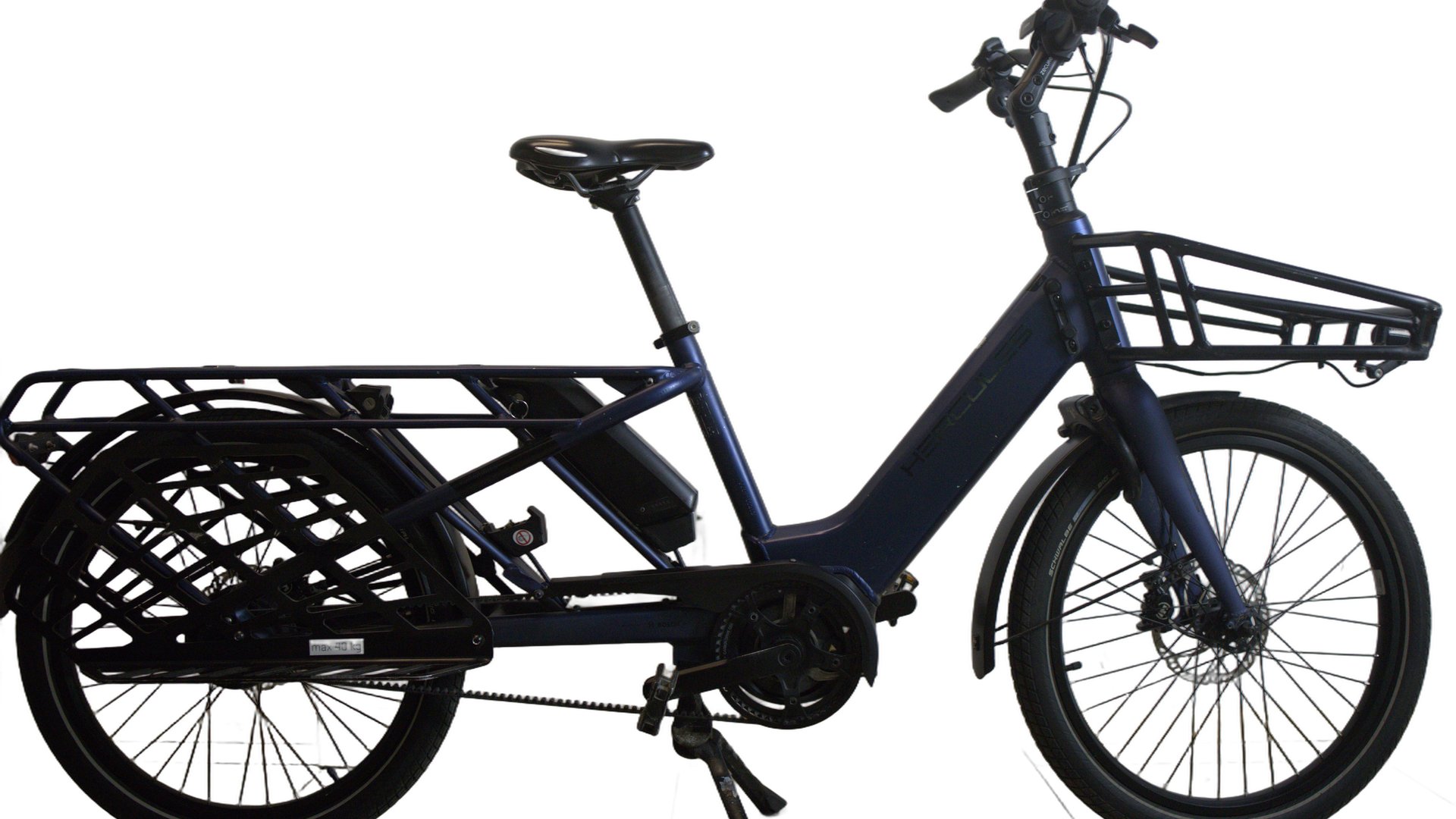 Hercules Rob Family er en kraftig og funksjonell lastesykkel som er designet for å tåle opptil 200 kilogram totalvekt - inkludert syklisten. Denne modellen kombinerer stabilitet, høy lastekapasitet og praktiske løsninger som langt bagasjebrett, beltedrift og Enviolo-gir. Sykkelen gir en umiddelbar positiv sykkelopplevelse da den føles som en vanlig elsykkel, er svært stabil og enkel å manøvrere, og god respons på styret. Sykkelen er også lett å stoppe og starte, selv i bakker eller ved lyskryss. Komforten er høy, med en oppreist sittestilling og et godt sete. Dette er en longtail-sykkel som har plass til opptil to barn og kan justeres for syklister mellom 165 og 190 cm. Modellen har trinnløst gir, reimdrift, kraftige fire-stemplede bremser fra Magura, og et 500 Wh batteri fra Bosch. Med en lasteevne på hele 200 kg og mulighet for å montere barneseter, er dette en allsidig lastesykkel for familier. Sykkelen har også front- og baklys samt en solid sykkelstøtte med to bein. Sykkelen kan leveres med monkeybar montert (se siste bilde) Dette koster kr 5000 kr. Det er også mulig å kjøpe et ekstra batteri mot en tilleggskostnad på kr 4000,-. Barneseter kan bestilles separat til kr 1500,- per stykk, og det finnes ulike alternativer som passer til sykkelen.