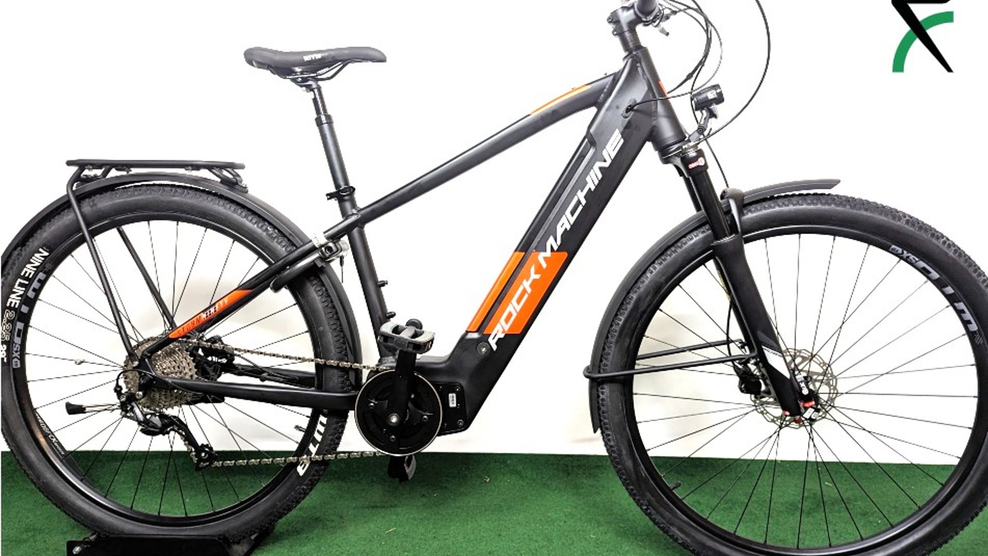 Populær og allsidig elsykkel. Rock Machine Storm INT e90-29 Touring har en kraftig 90 Nm Sport Drive-motor og integrert batteri på hele 500 Wh som lar deg sykle opptil 100 km med assistanse. Sykkelen har geometri som gir deg en behagelig sittestilling både i byen og i terrenget. Med dempegaffel og kraftige dekk er sykkelen klar for brostein, fortauskanter og stier. Storm INT kommer ferdig utstyrt med skjermer, bagasjebrett, lykter og lås. 90 Nm Sport Drive krankmotor 500 Wh integrert batteri, opptil 100 km rekkevidde Microshift 1x8 gir og hydrauliske skivebremser Rock Shox Judy dempegaffel Utstyrt med skjermer, bagasjebrett, lykter og lås Motor og batteri Elsykkelen kommer med motor og batteripakke fra merket Sport Drive. Den er med sine 90 Nm veldig sterk og kan dra tungt uten at man føler at det går sakte. Batteriet gir opp mot 100 km rekkevidde*. Batteriet kan lades mens det er på sykkelen, eller det kan taes av hvis man vil lade batteriet en annen plass en hvor sykkelen står. Et deksel vippes til side så kan man enkelt ta ut batteriet fra underrøret. Girsystem Ellers er denne elsykkelen utstyrt med Microshift Acolyte girsystem, med åtte gir. Disse skifter man mellom med høyre hånd. Med venstre hånd har man displayet der man kan velge de forskjellige elsykkelmodusene. Sport Drive motoren har fire ulike modus. Modusen som gir mest kraft bruker også mest batteri, og omvendt. Disse fire moduser kan enkelt velges mellom, selv i fart, ved å trykke på knappene på displayet på venstre side av styret. Bremser Elsykkelen har hydrauliske skivebremser fra Alhonga. Det gir særdeles god og kontrollert stoppekraft når du trenger det, uansett om det er vått eller tørt ute. Forbrems er på venstre side og bakbrems er på høyre side. Det er ikke pedalbrems, så man kan ikke bremse med å "tråkke bakover".
